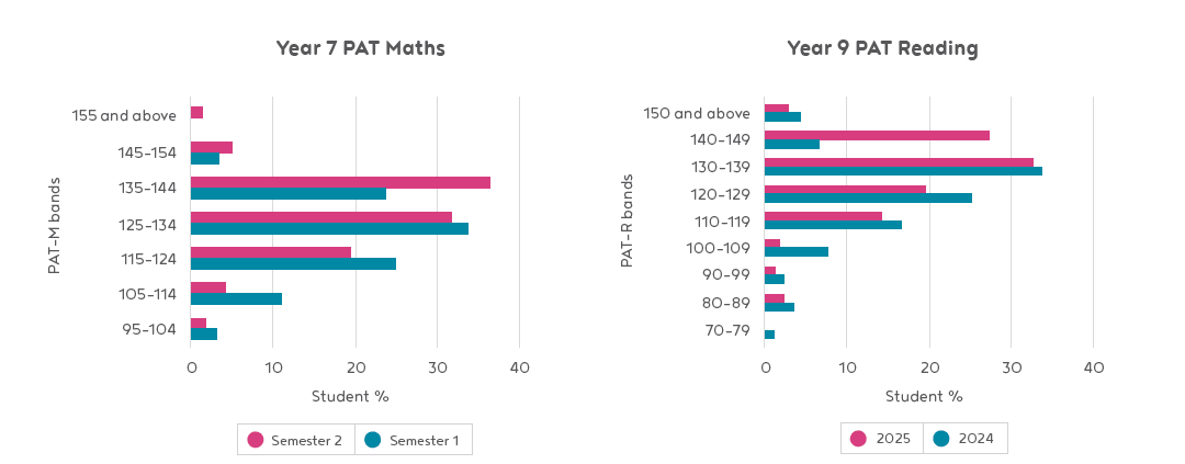 Implementation of the Full Participation Principles began in the Mathematics faculty, with the Mathematics Leader facilitating professional learning and modelling explicit teaching practices and use of the Ochre slides as a base resources. Their efforts paid off. For Maths, there was a clear upward shift in achievement for Year 7 students, with the proportion of students in the highest band increasing from 24% to 37% and a reduction in the mid and lower bands. In Reading, Year 9 students at the 140 – 149 achievement band went from 6.6% in 2024 to 27% in 2025.